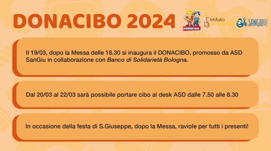 - Martedì 19 Marzo: ore 18.30 Messa per San Giuseppe ed a seguire, per chi verrà, apertura del DONACIBO e raviole offerte da ASD SanGiu