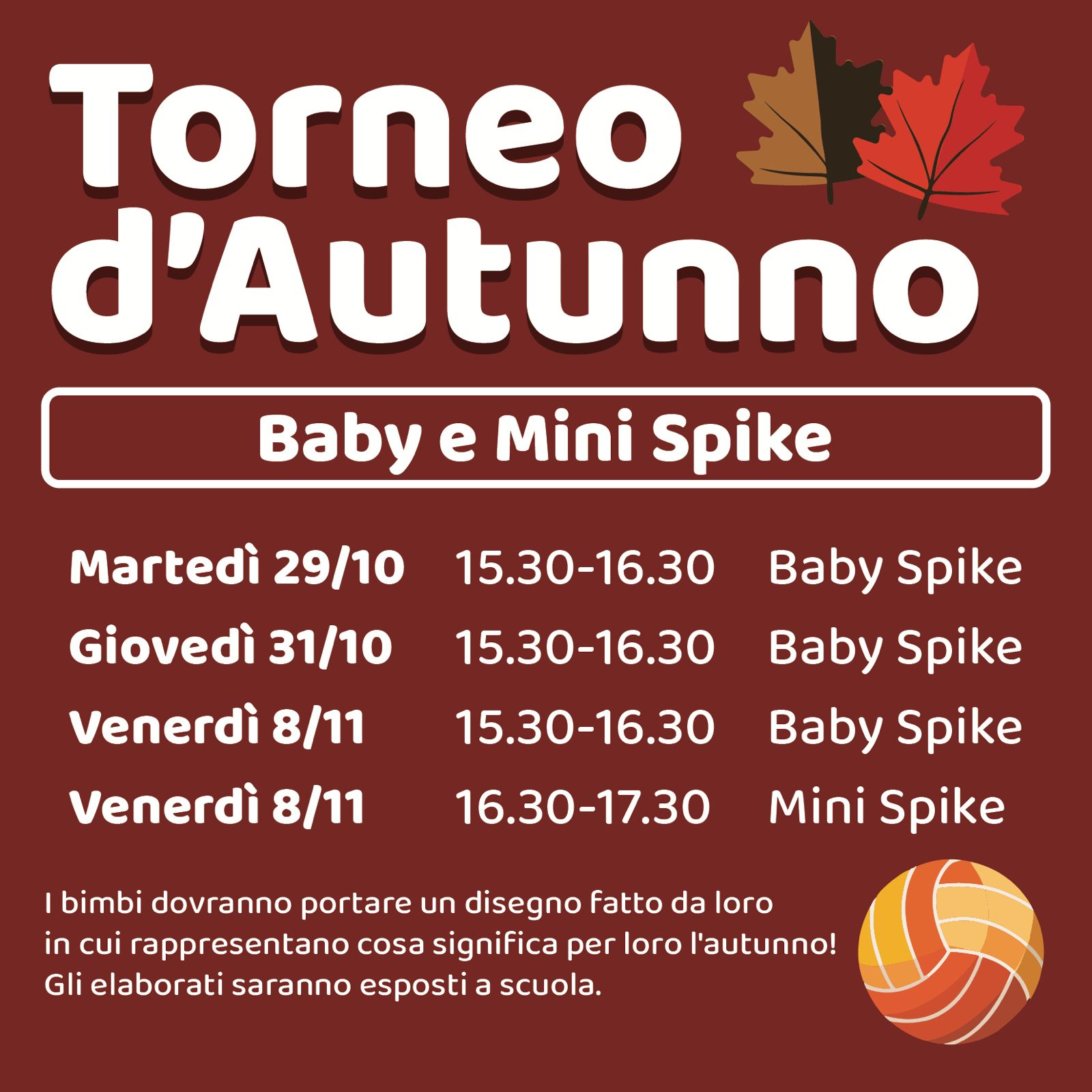 Infatti, martedì 29 Ottobre, giovedì 31 Ottobre e Venerdì 8 Novembre, ci sarà il Torneo d’Autunno per i bimbi partecipanti al corso di BABY e MINI SPIKE.